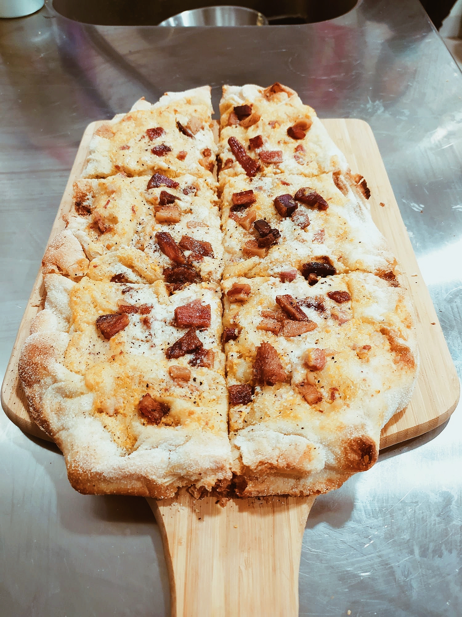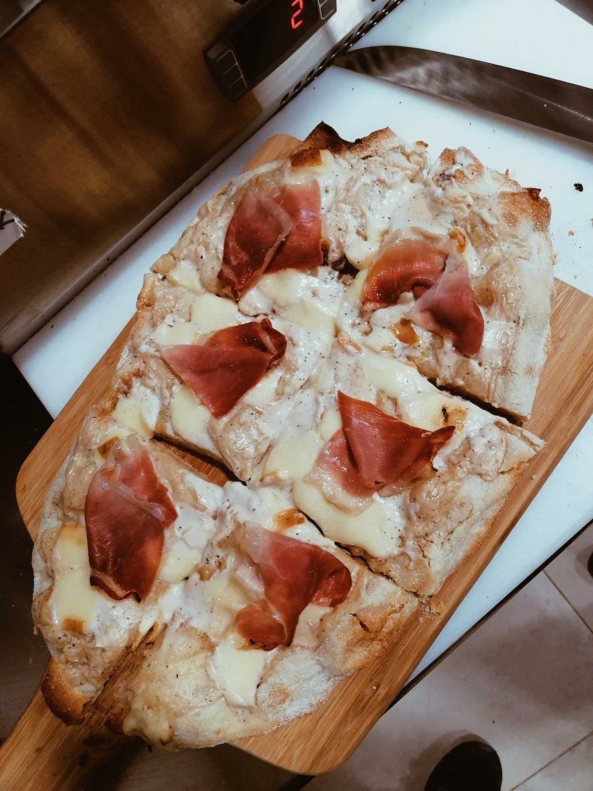 Pero si eres de los amantes del sabor ahumado nuestra pinsa cacio e pepe con speck será un absoluto descubrimiento para ti. Esta crujiente masa romana, se acompaña en este caso de queso ahumado, pimienta negra y jamón ahumado.